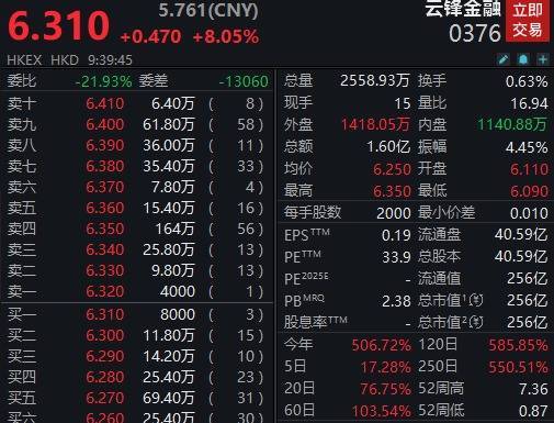 云锋金融开盘涨4.62%,截至发稿,股价上涨8.05%,现报6.31港元,成交额1.6亿港元。